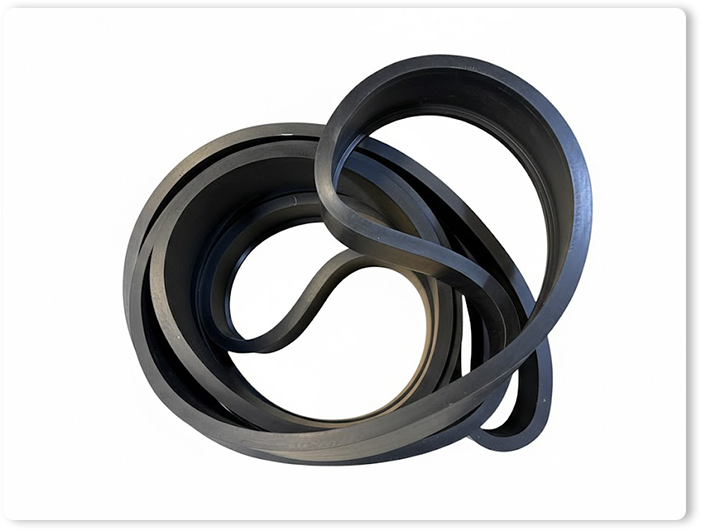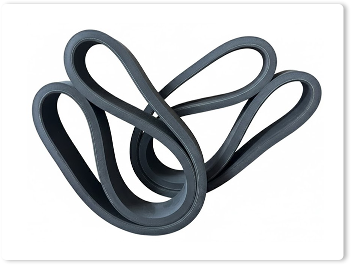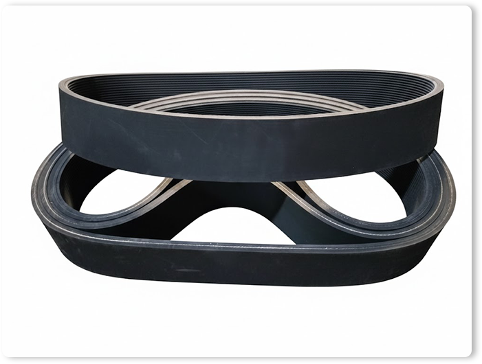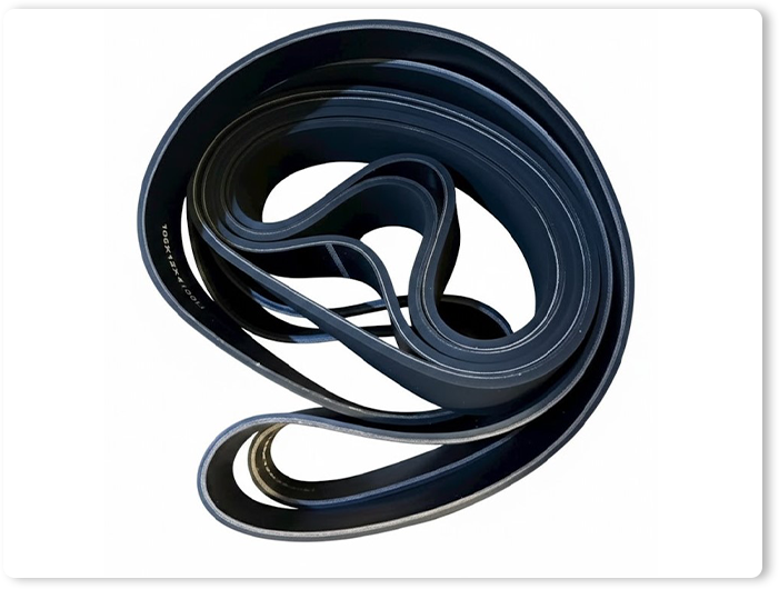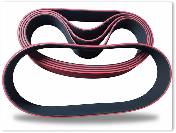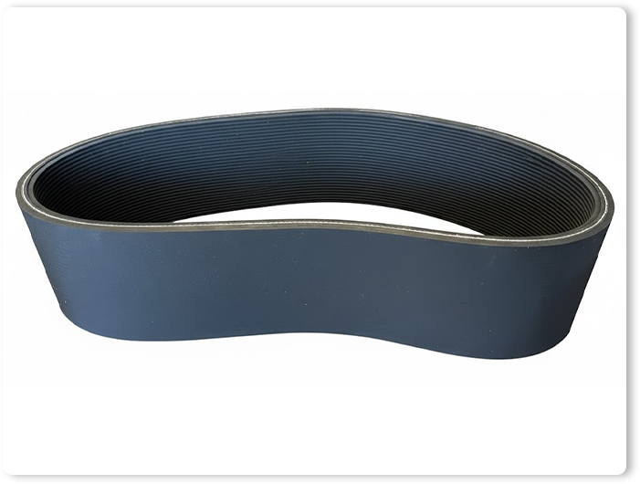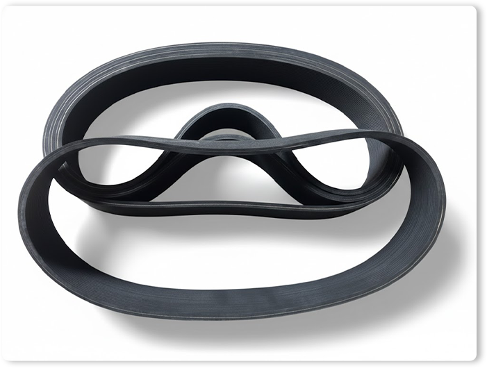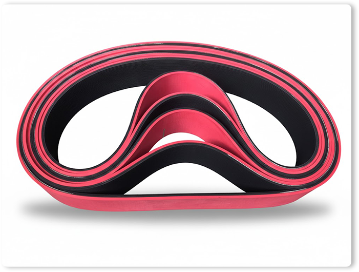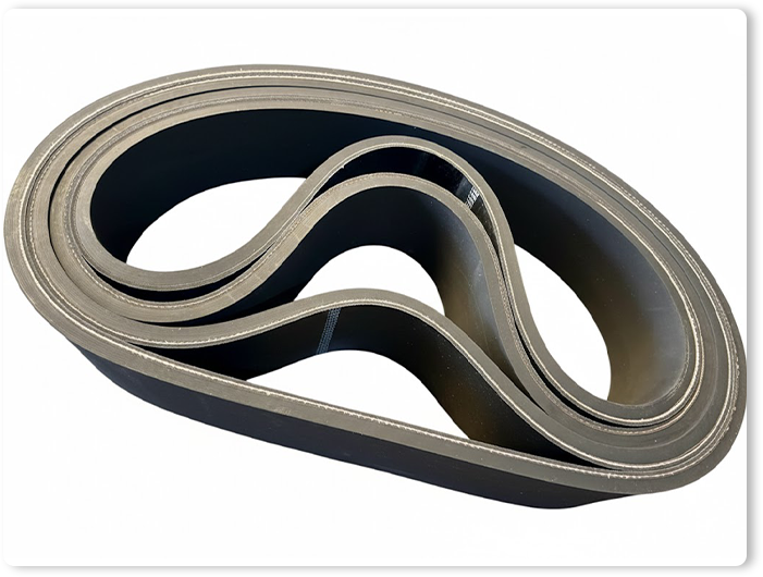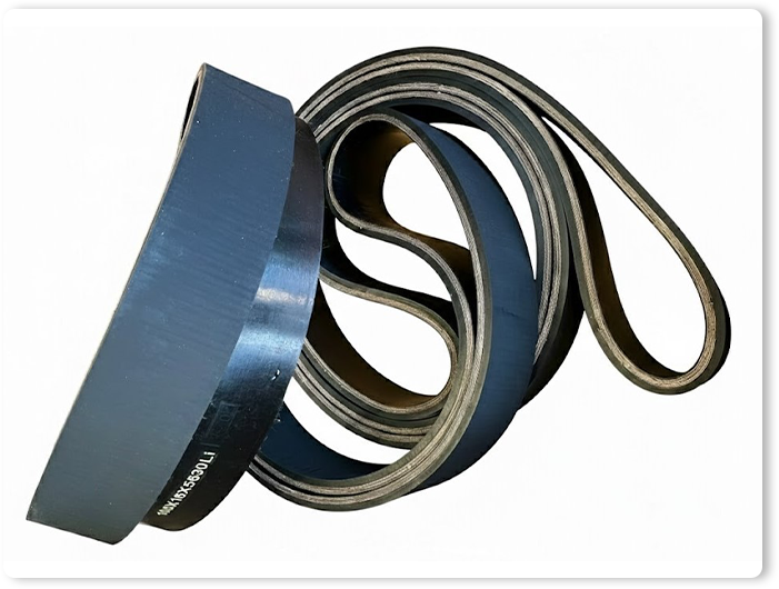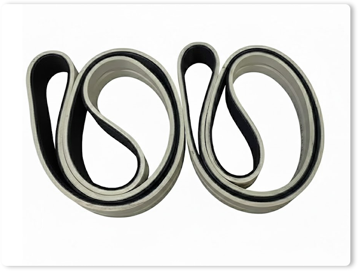 เป็น ทำมาจากวัสดุโพลียูรีเทน (Polyurethane – PU) คุณภาพสูง ซึ่งเป็นพลาสติกที่มีความยืดหยุ่น แข็งแรงทนทานต่อการเสียดสี ทนน้ำมัน สารเคมี และไม่ค่อยยืดตัว ภายในโครงสร้างมักเสริมความแข็งแรงด้วยแกนลวดสลิงเหล็ก (Steel Cord) หรือ เส้นใยอะรามิด (Aramid) เพื่อให้รับแรงดึงสูงและคงรูปได้ดี