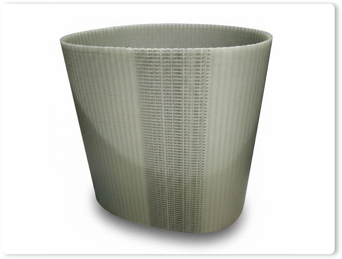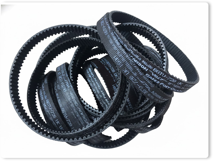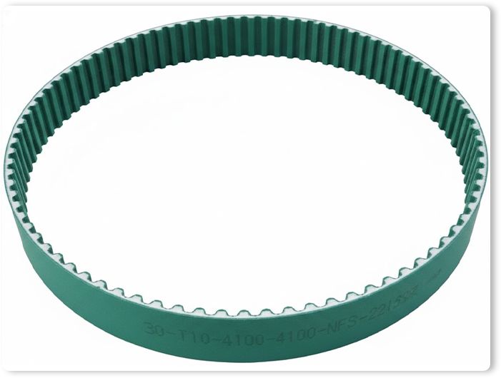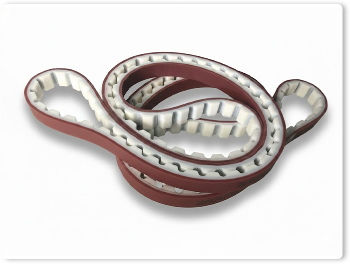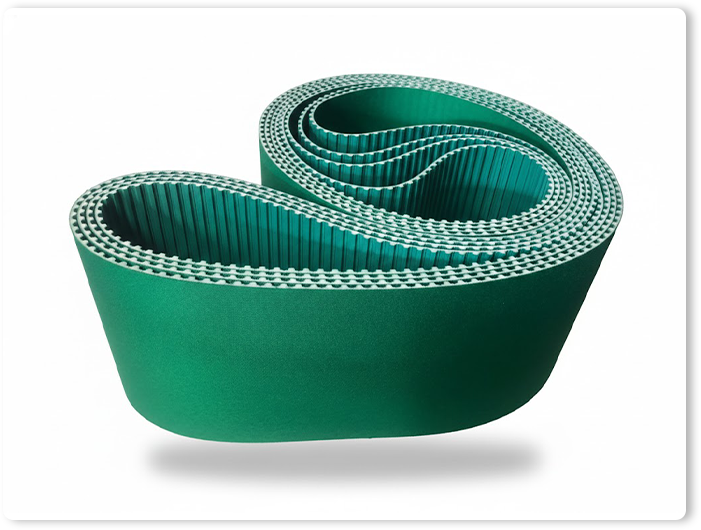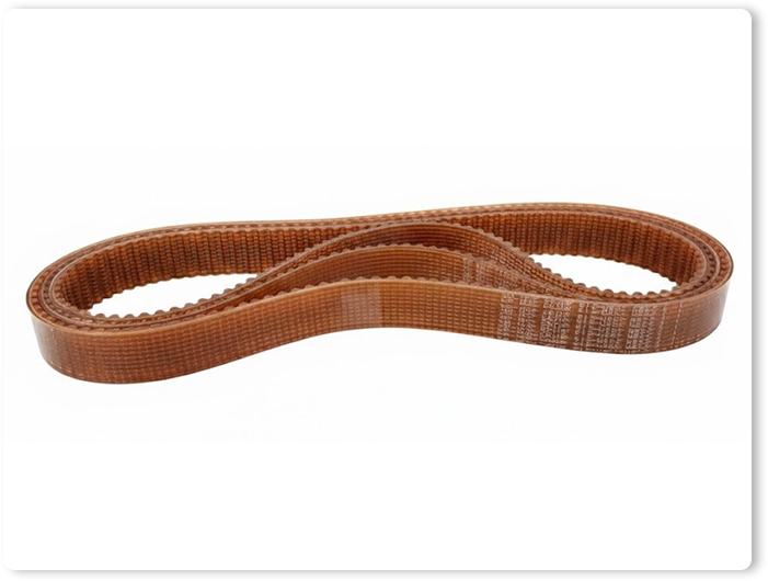 เป็น ทำมาจากวัสดุโพลียูรีเทน (Polyurethane – PU) คุณภาพสูง ซึ่งเป็นพลาสติกที่มีความยืดหยุ่น แข็งแรงทนทานต่อการเสียดสี ทนน้ำมัน สารเคมี และไม่ค่อยยืดตัว ภายในโครงสร้างมักเสริมความแข็งแรงด้วยแกนลวดสลิงเหล็ก (Steel Cord) หรือ เส้นใยอะรามิด (Aramid) เพื่อให้รับแรงดึงสูงและคงรูปได้ดี